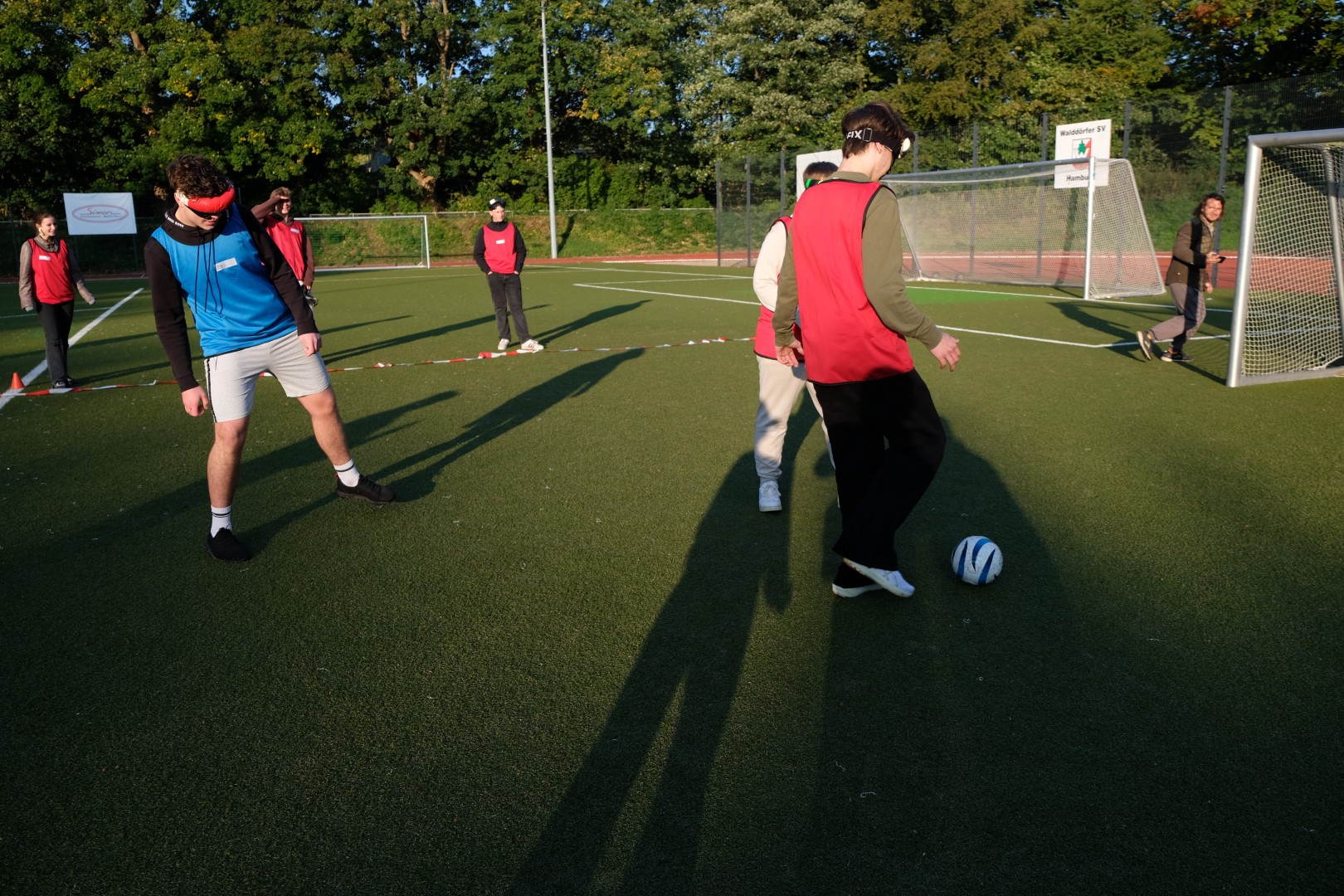 Statt geplanter drei Schulstunden war der Sportplatz an der Stadteil-Schule Walddörfer allerdings nur in der ersten Stunde frei. Es gab also „nur“ eine ganz kompakte Einheit, bei der am Ende aber sogar drei gegen drei gespielt werden konnte. „Das war eine gelungene und erfolgreiche Blindenfußball Sensibilisierung, weil alle Teilnehmerinnen aktiv mitgemacht haben und Spaß hatten. Im Spiel 3 gegen 3 entstand Chaos, aber es vielen auch Tore. Guides und Spieler waren gemeinsam erfolgreich. Die Feedback Runde der Mitschüler lieferte viele positive Eindrücke.“