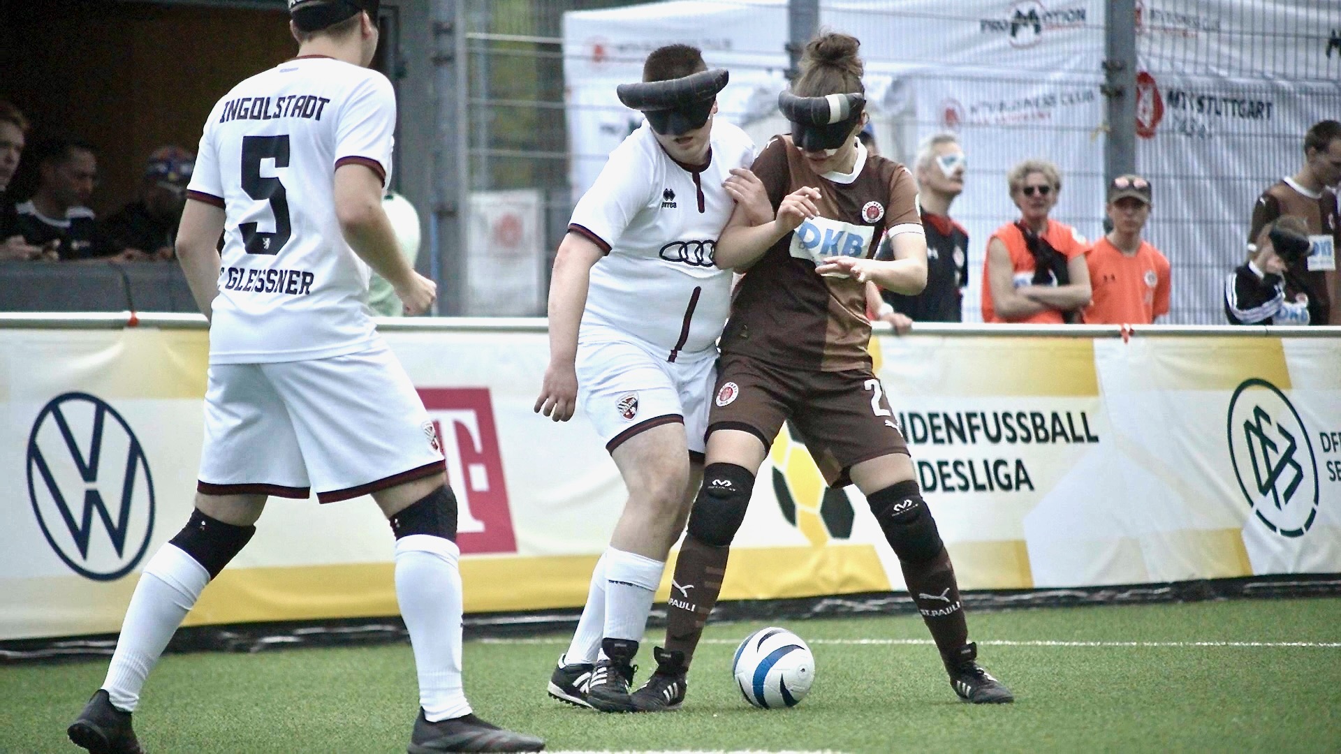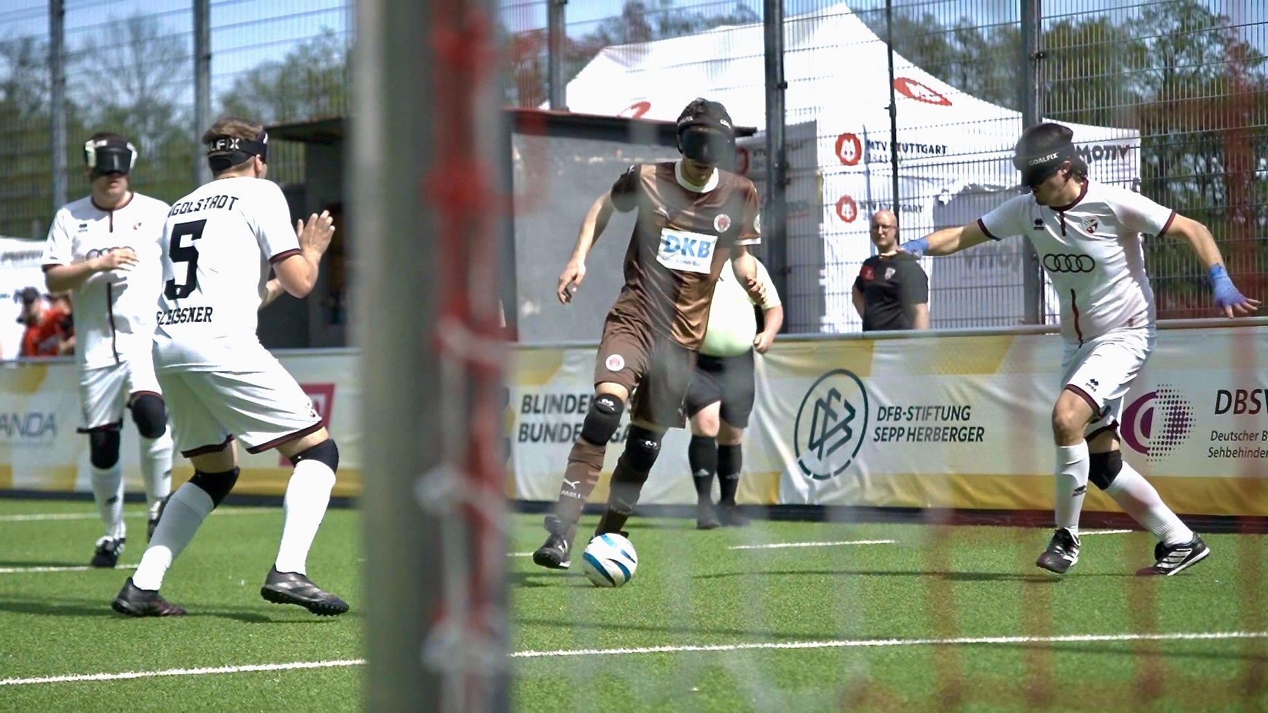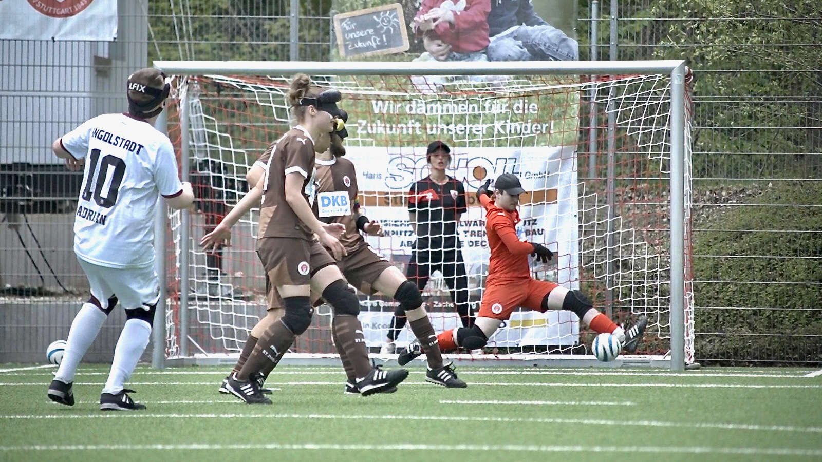 Die bereits 19. Saison der DBFL bescherte dem Team des FC St. Pauli einen Saisonauftakt am 18.4.2026 in Stuttgart gegen den FC Ingolstadt. In der Saisonvorbereitung konnte in diesem Jahr kein internationaler Gegner für Testspiele gefunden werden. Die Terminkalender werden immer dichter und gleichzeitig die Kader der Teams dünner. Wo steht unser Team, war daher die spannende Frage. Ein neues Gefühl war, dass im Zug die Reisegruppe Liga-Team des FCSP, die aktuellen Abgänge bzw. verliehenen Spieler, Calvin Runge, Jana Marquart und Marie Jürgens mit großem Hallo begrüßte. Calvin spielt in der beginnenden Saison 2026 für Ingolstadt, Marie und Jana für den 1. FC Köln. Kennern der Blindenfußballbundesliga sagt der Name Köln etwas. Früher als PSV Köln bekannt, jahrelang Mitglied in der Blindenfußball Bundesliga, tritt das Team nun unter dem Dach der FC Köln Stiftung nach längerer Pause wieder im Ligabetrieb an. Die Blindenfußball Bundesliga umfasst damit zum aller ersten Mal 10 Teams und trotzdem könnte ein „Super Fan“ alle Spiele der Blindenfußball Bundesliga sehen, da sie alle nacheinander stattfinden. In Spiel eins 2026 trifft Köln auf Marburg (0:10). In Spiel zwei der FC St. Pauli auf Ingolstadt. Unser Team hat den verletzungsbedingten Ausfall von Nationalspieler Rasmus Narjes zu verkraften, kann ansonsten aber in bester und voller Teamstärke antreten. Die 17 köpfige Reisegruppe fuhr am Freitagmittag mit der Bahn nach Stuttgart. Samstag morgens um 7:00 vor dem Frühstück Warmlaufen war für einige Aktive eine neue Erfahrung. Danach ausgiebige Teambesprechung, mit Linien-Bus zum Kräherwald, Heimspielstätte des MTV Stuttgart. Nach dem Pre-warmup, ging es auf den Platz. Michael Löffler, dienstältester Spieler des FC St. Pauli geleitete das Team auf den Platz leitete die Teamansprache und startete die Spielvorbereitungsphase auf dem Pitch. Auch das war neu. Ebenso das Positions-Rondo mit angetippten Ballübergaben. Der Grad der Nervosität zu Beginn von Liga-Wettkampfspielen trotz jahrelanger Erfahrung ist immer wiederkehrend, gar nicht neu und trotzdem speziell. Gegen Ingolstadt musste ein Sieg her, wenn die Mission fünfter Titelgewinn nicht schon am ersten Spieltag unmöglich oder sehr schwer werden sollte.