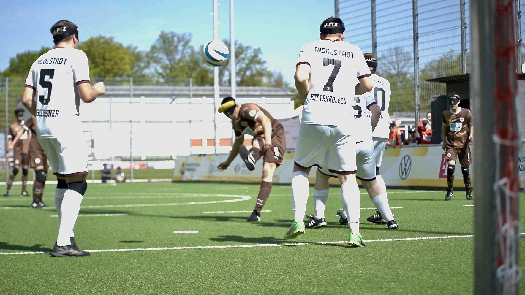 1:0 Natan Werner. Thoya Küster presste den FCI Spielmacher Jan Adrian an der linken Bande und zwang Ihn zum Sohlenableger in die Mitte die unser Spieler Natan vor dem „vierer Verteidigungsblock“ des FCI im Nachfassen ins Dribbling am Block vorbei mitnehmen konnte. Schuss dann flach unten links ins Tor verdeckt für den Torhüter Michael Wenczel. Der neue Keeper des FC Ingolstadt war früher einmal Fußallprofi bei Eintracht Frankfurt, FC Augsburg und FC Ingolstadt gewesen. Vom Profi-Innenverteidiger zum Blindenfußball Torwart, auch eine neue spannende Karriere Geschichte.