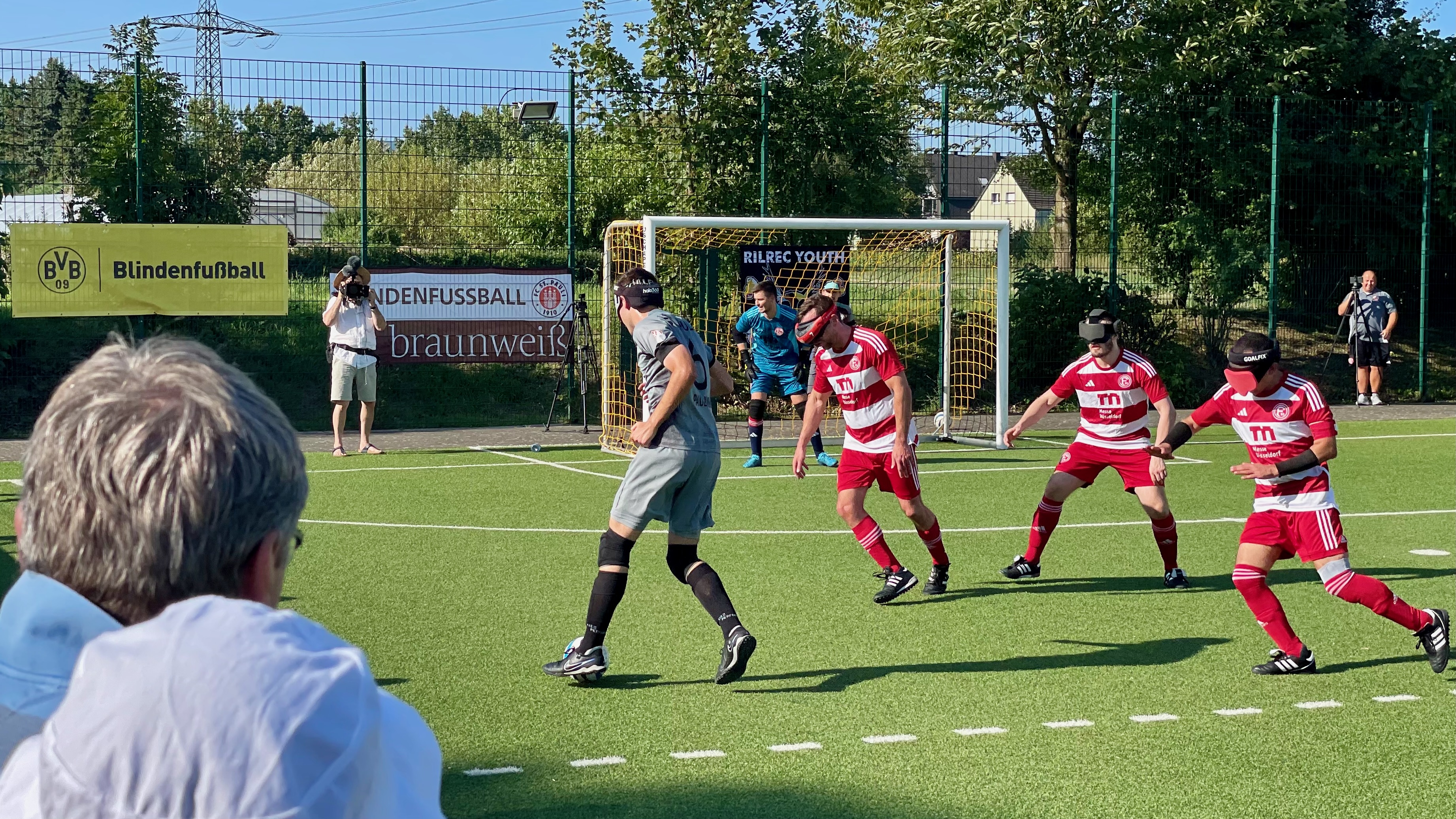 Am Sonntag (25.8.) ging es dann gegen den FC Ingolstadt 04. Der FCI hatte am Vortag seinen ersten Punkt in der Blindenfußball-Bundesliga erzielt – Gratulation an dieser Stelle! Ruge spürte kurz nach dem Spiel gegen die Fortuna Schmerzen im Bereich des Knies, er kam gegen Ingolstadt nicht zum Einsatz. Es war das U-20-Sturmduo Thoya Küster und Natan Werner, die durch aggressives Anlaufen den Ingolstädter Spielaufbau frühzeitig unterbrachen und Ballverluste provozierten. Das am Vortag noch offensive agierende Team aus Ingolstadt nahm eine deutlich defensivere Position ein, sodass sich oftmals ein*e Stürmer*in der Braun-Weißen gegen drei Verteidiger durchsetzen musste. Nach fahrigem Beginn war die 18-jährige Thoya Küster, die nach einem Solo den längst überfällige Treffer zum 1:0 erzielen konnte. Es schien, als ob der Bann gebrochen worden ist, als Natan Werner kurz danach aus zehn Meter halblinker Position den Ball ins linke Eck hämmerte. Ein schönes Zusammenspiel zwischen Küster und Philipp Versen, nach einer Freistoßvariante, die nur knapp am Tor des FCI vorbeiging, machte Vorfreude auf das, was in der zweiten Hälfte noch kommt. Zur Pause blieb es beim 2:0.