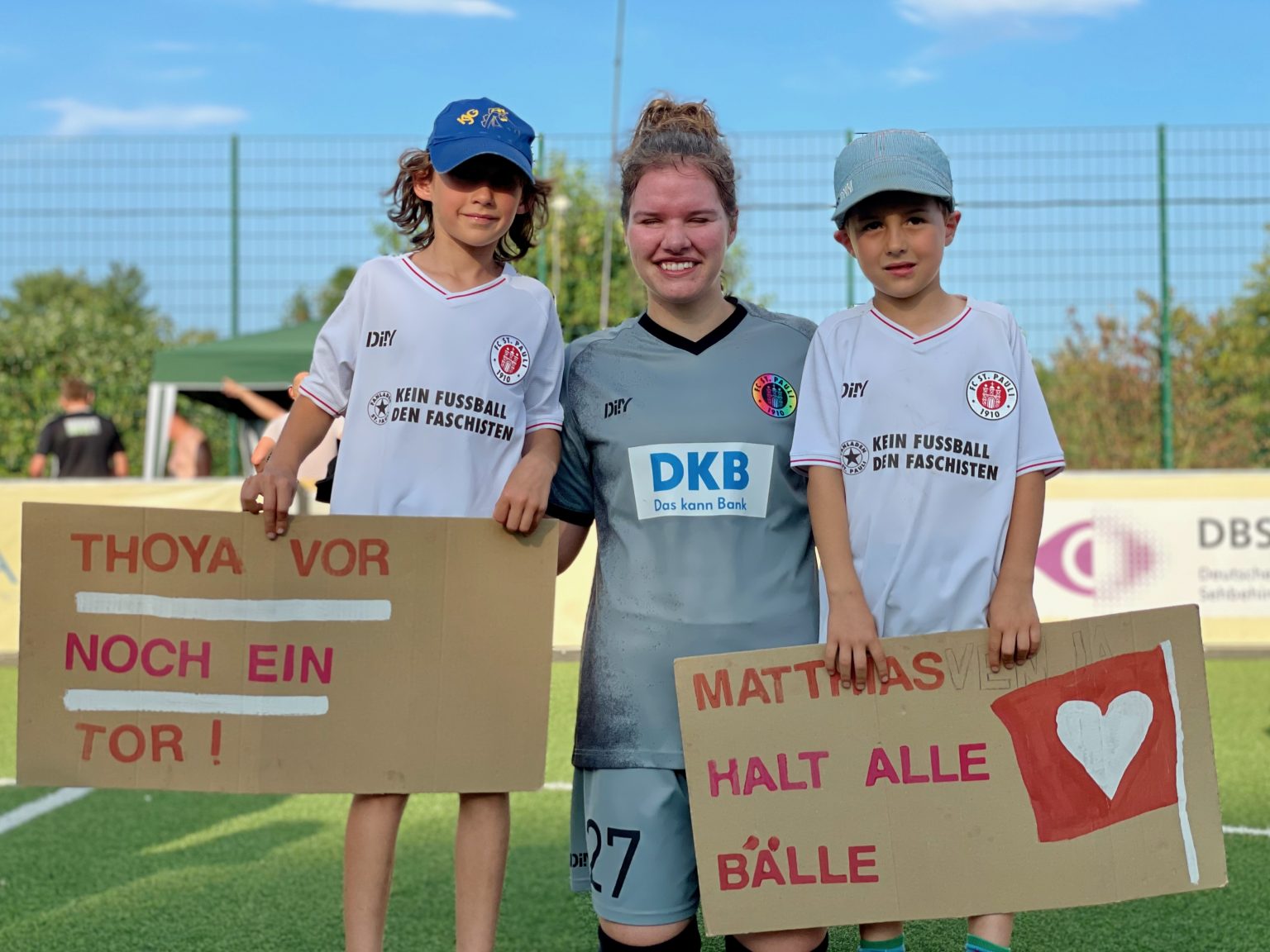In der letzten Partie des ersten Tages trafen die Kiezkicker*innen auf Fortuna Düsseldorf. Das Spiel nahm kurz nach Anpfiff schnell Fahrt auf – es war Paul Ruge, der mit seinem Tempo die Düsseldorfer Verteidigung überrannte und Nationaltorwart Nils Hemmenstädt keine Chance ließ. Leider konnte man das Tempo nicht hochhalten und so wurde die Partie schleppend und träge. Unser Team verteidigte konsequent, fand im Konterspiel aber keine passende Lösung für das engmaschige Verteidigungsspiel der Düsseldorfer. Dann war es aber die an diesem Wochenende überragende Thoya Küster, die aus kurzer Distanz den Ball ins Tor schoss. Nur wenige Sekunden später machte es Stürmerkollege Natan Werner nach und spitzelte den Ball aus kurzer Distanz am am Düsseldorfer Keeper vorbei ins Tor.